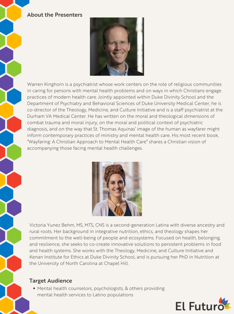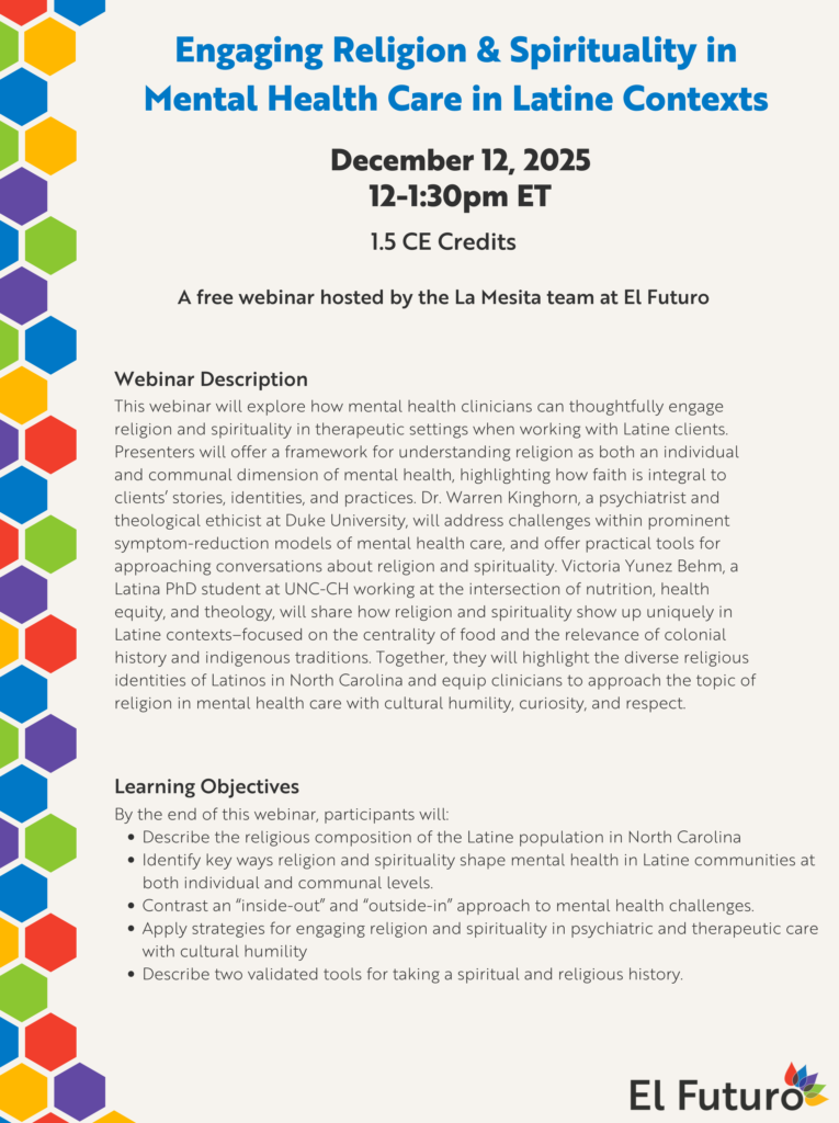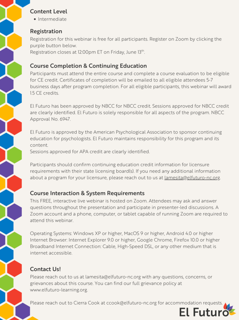 Participants should confirm continuing education credit information for licensure requirements with their state licensing board(s). If you need any additional information about a program for your licensure, please reach out to us at lamesita@elfuturo-nc.org.